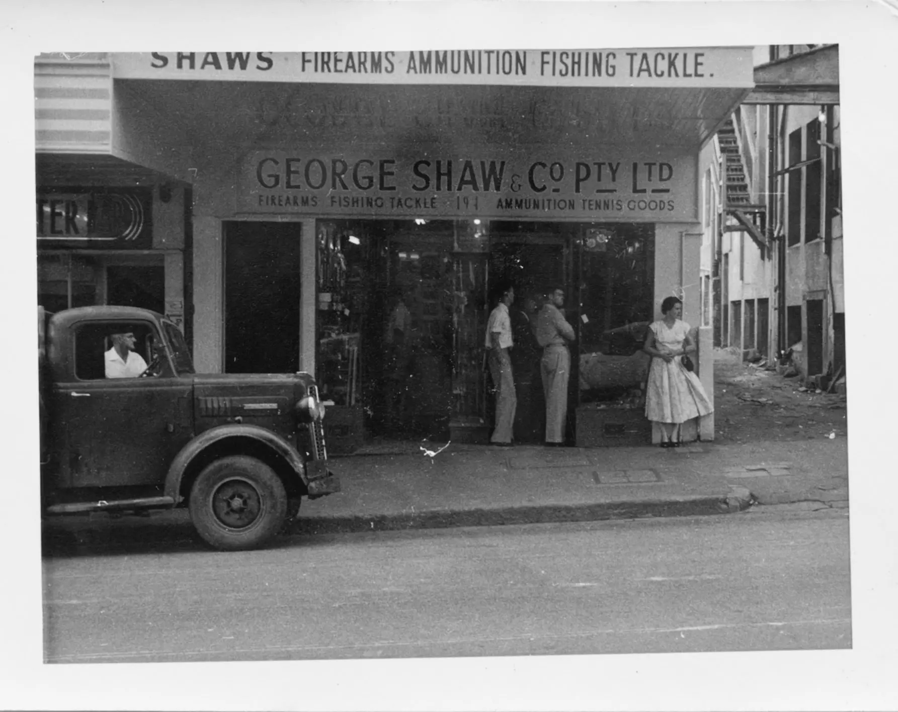 Our Shaw family history goes back to George Shaw senior, son of William Shaw and Mary McCurry, migration from Ireland to Australia. The Firearms & Fishing store in Albert Street in the early1930’s, and Albert street i general, appears to have no digitised photographs on record. The same can be said of many city streets. A few original photos are now with the Brisbane (QLD) State Library archives, June 2022. These can be seen in the “blue” folder called George Shaw Sports Store 1908 – 1979 on this website.