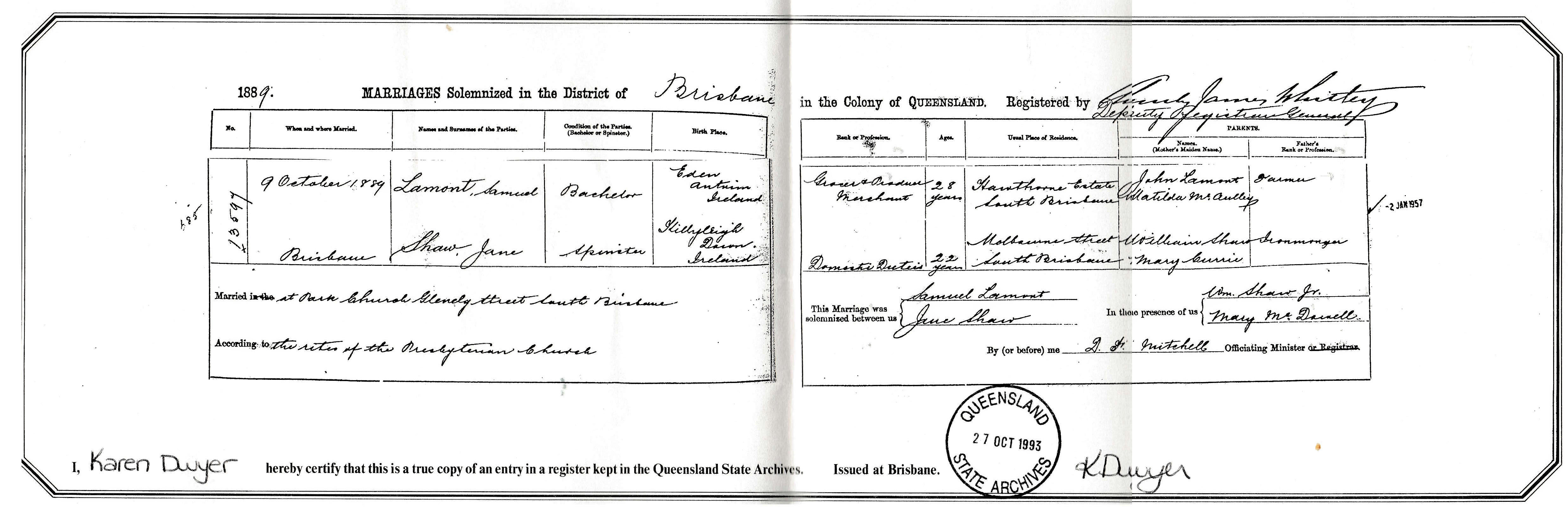 It took a while to work out why George told the National Australian Rifle Association in 1906 (for membership) that he was “English-born”. This threw a spanner in the works. It would mean we were not related to William Shaw who founded Shaw & Sons in Bribane. We learnt that Northern Ireland was postal listed as the United Kingdom, and with the “troubles” of Ireland and UK, it made sense to say you were English born. There may have been other things going on we don’t know, causing him to say this. After downloading George’s marriage certificate, we then knew we were related to William – not to promote pride in our past, but it helps put a little more perspective on who we are today.